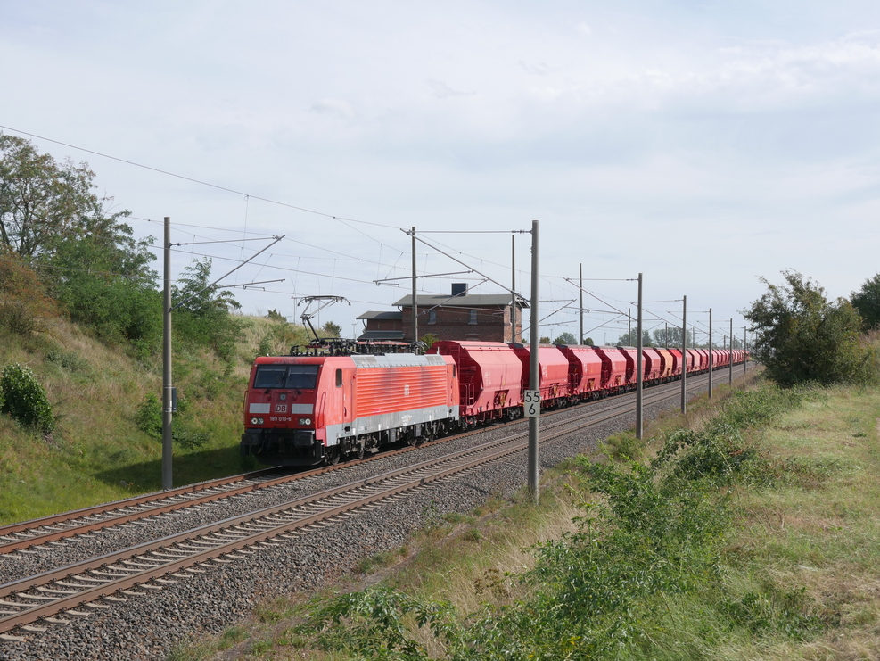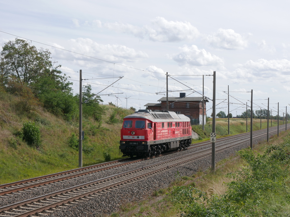 232 589 sollte am 04.09.25 eigentlich als Lz von Halle nach Bernburg Zementwerk fahren, um den Leerzug des Vortages wieder abzuholen. Um die wegen Bauarbeiten derzeit nur eingleisig befahrbare Strecke Köthen - Baalberge nicht mit Lz-Fahrten noch weiter zu überlasten, ging es ab Köthen-Süd als Vorspann eines Leersalzers bis nach Baalberge.