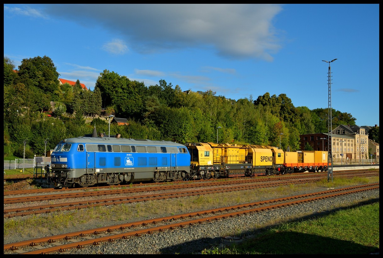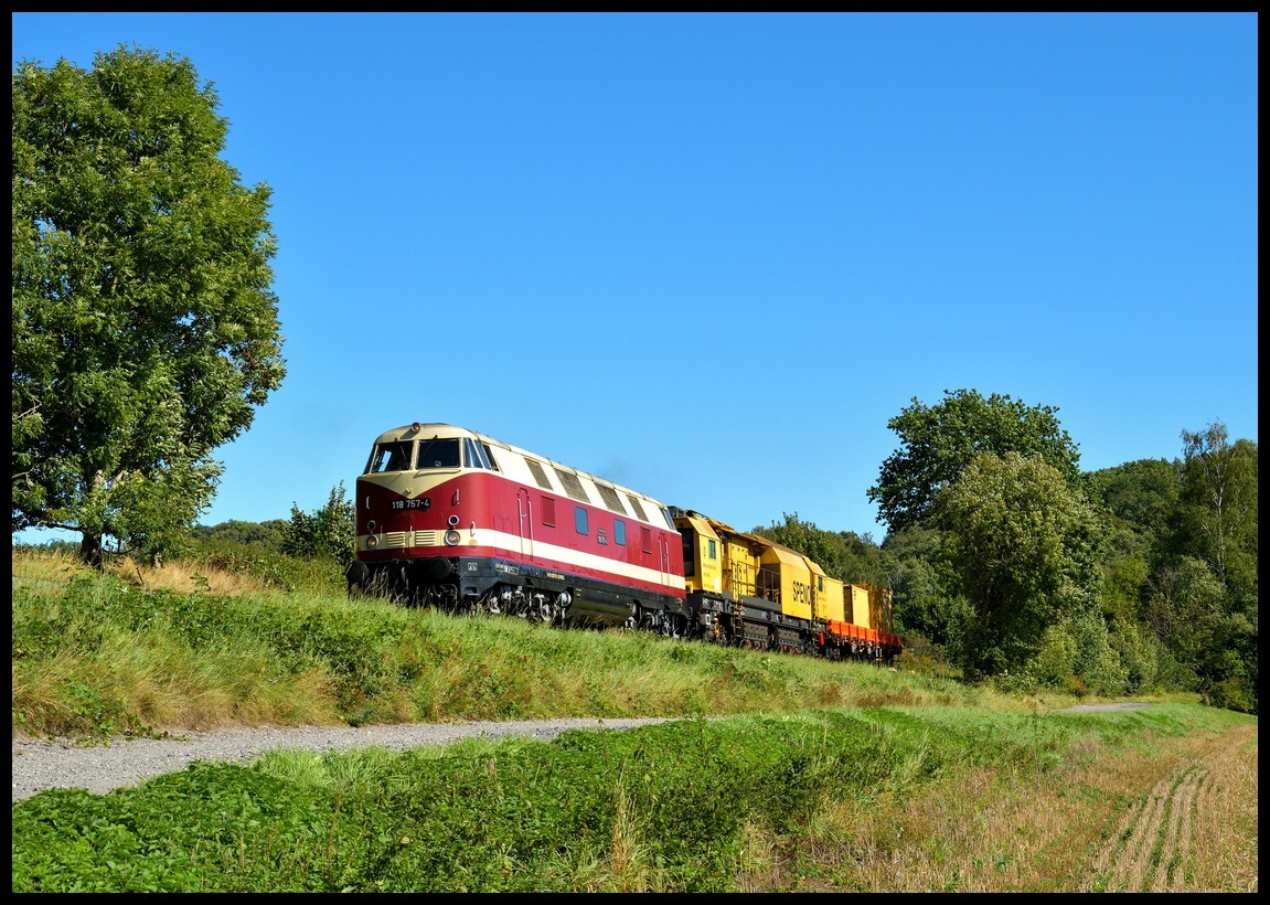 Bevor die 118 757 heute Nachmittag den VSE Zug nach Zwickau holt, um morgen ab Zwickau zu den Sonderfahrten auf der BSg zu startet, hatte die Maschine am gestrigen Mittag die Aufgabe, den SPENO-Schleifzug nach Wolkenstein zu überführen, dazu die Arbeit etwas eher veerlassen und ein Bild beio Lössnitz gemacht.