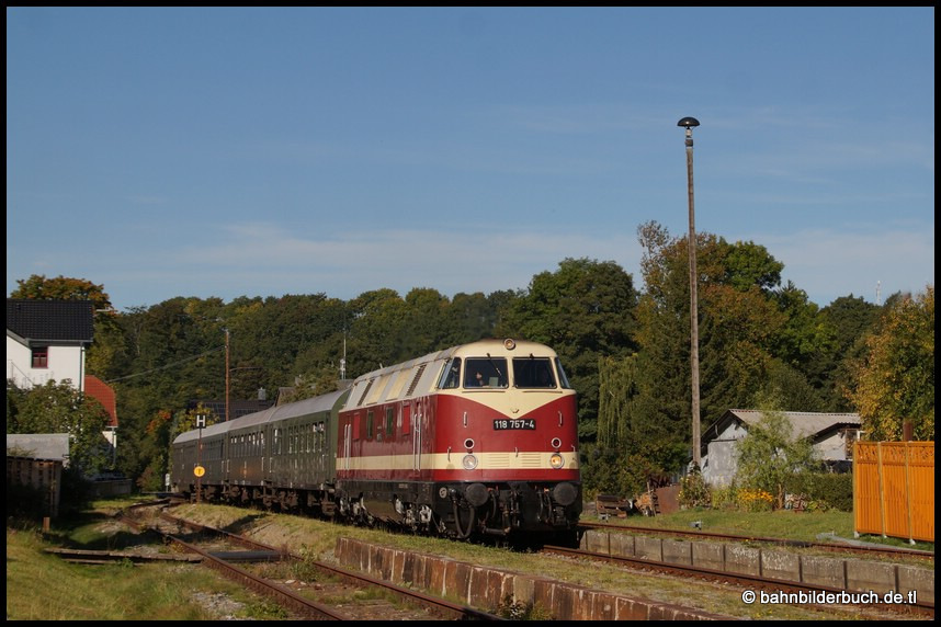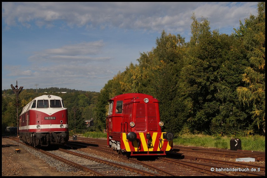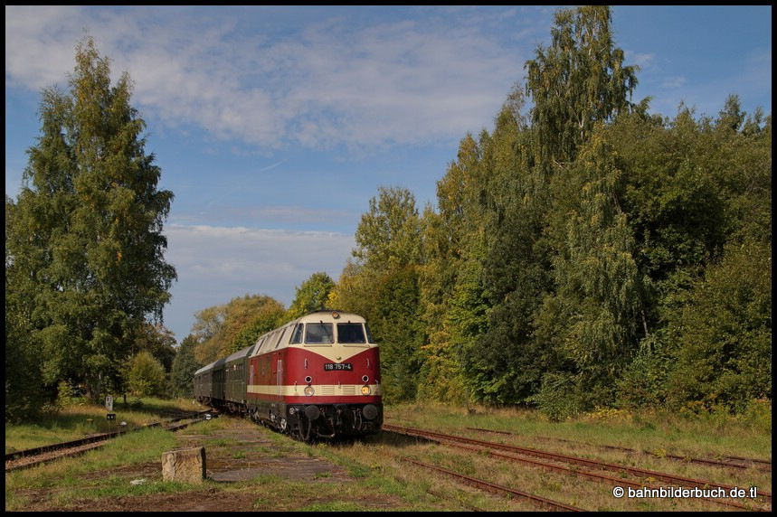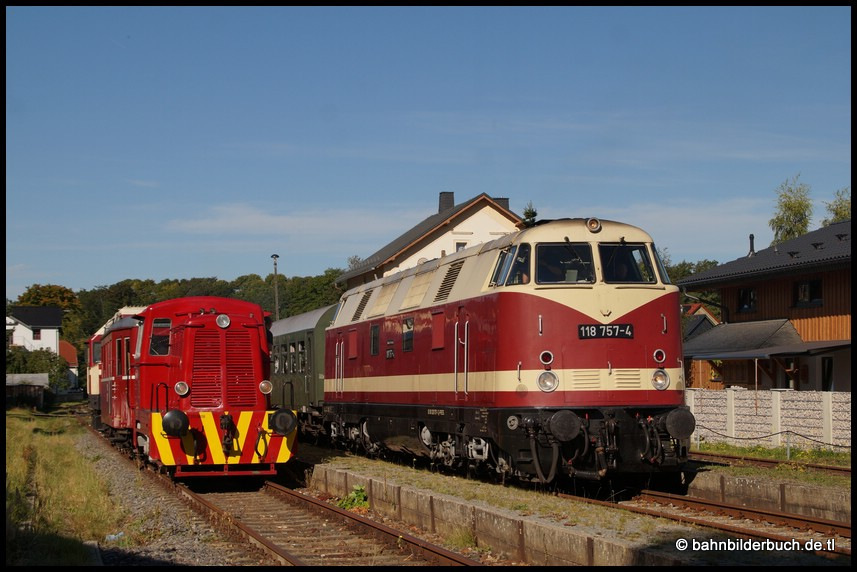 In Grünstädtel, dem geschichtsträchtigen Bahnhof kurz hinter Schwarzenberg, wollte ich unbedingt auch die 118 der Press in Szene setzen. Nachdem am Samstag Mittag das Vorhaben einer Fotowolke zum Opfer gefallen war, gelang es schließlich am Sonntag.