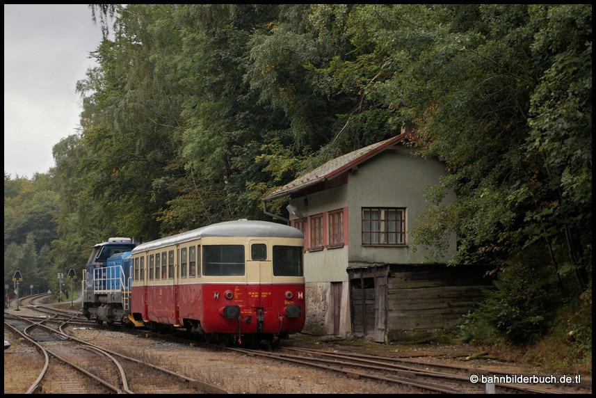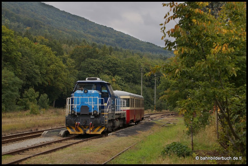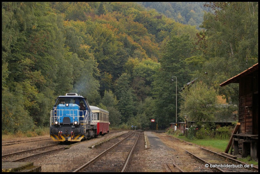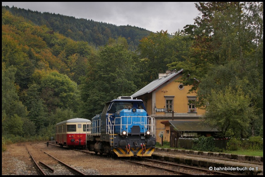Am 27.September verschlug es 742 771-9 auf die Moldavská horská dráha - Bahnstrecke Moldava - Most. Výtopna Slaný "Železniční muzeum a výletní vlaky" machte an diesem Tag einen Ausflug ins obere Erzgebirge. Anschließend wurde das Kloster Osek, eine ehemalige Zisterzienser-Abtei und bedeutendste Klosteranlage Nordböhmens besucht. Das Wetter im Osterzgebirge sollte eigentlich sich bessern und im böhmischen Becken erst recht. Um es vorweg zu nehmen, es trat natürlich nicht ein. Nun gut, eine Sonderfahrt auf der Strecke 135 ist immer eine Reise wert. Die Bilder aus Moldava v Krušných horách von dem drüben Nebelwetter las ich mal weg, zumal der kleine Zug von Dubi geschoben auf den Kamm des Erzgebirges gelangte. Bei der Rückleistung von Moldava v Krušných horách über Dubi (Eichwald) nach Osek (Ossegg) entstanden dann doch noch paar brauchbare Aufnahmen.
