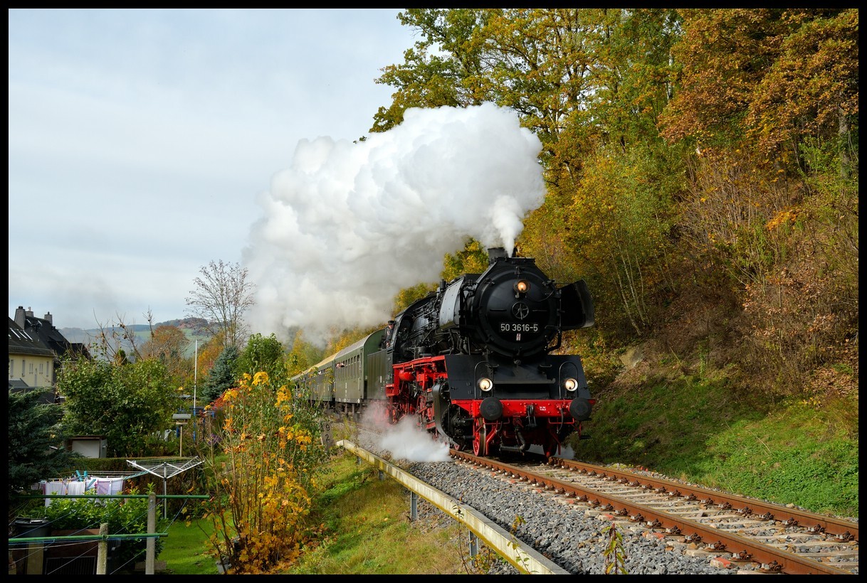 Auch ich war am Sonntag nach der Schwarzenberger 50 3616-5 im Dienste des SEM Chemnitz schauen. Ursprünglich sollte das Wetter besser sein, als es dann tatsächlich war, aber bissel Sonne gab es dann doch. In Lößnitz an der oberen Bahnhofstraße tat sich das Zentralgestirn noch schwer. Immerhin spärliches Hilfslicht erhellte die Szenerie, als der Dampfer Richtung Aue rollte.