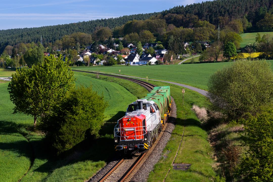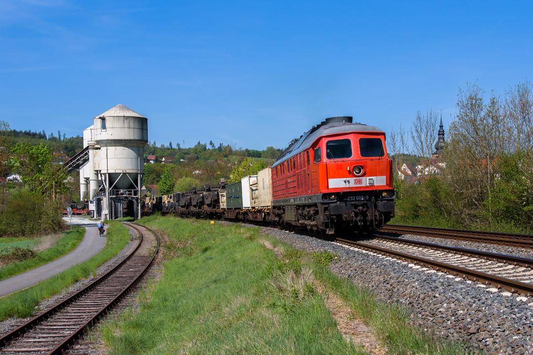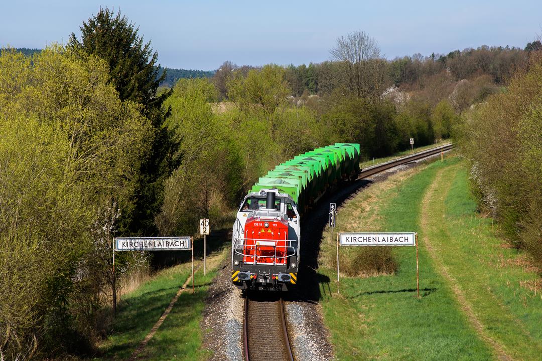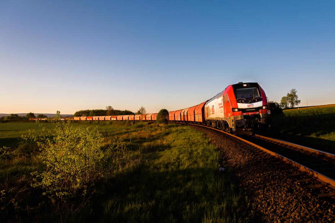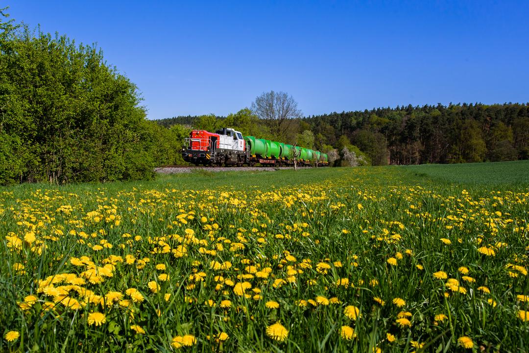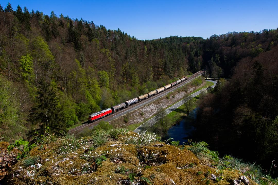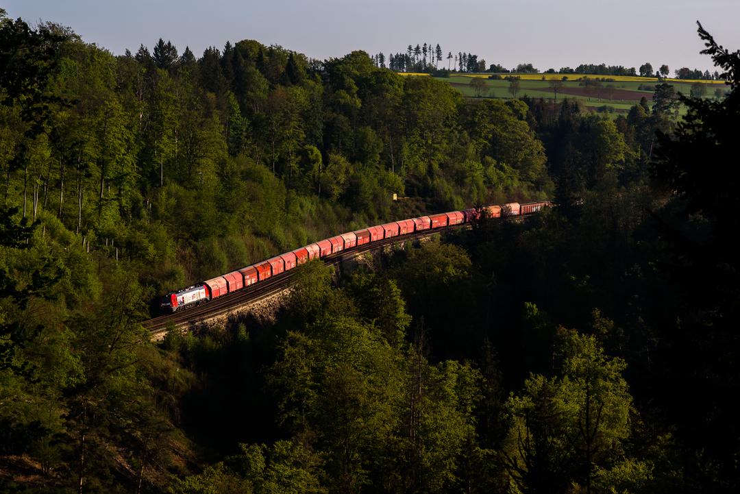 Ein Highlight ist die seltene Leistung mit Malz zur Firma Ireks nach Kulmbach. Der Zug fährt im Jahr nur wenige Male und kommt dann meist sehr früh und fährt erst am frühen Abend zurück. Mal noch im Licht, mal nicht. Hier hat alles perfekt geklappt und der Zug konnte an den roten Felsen bei Burgkunstadt festgehalten werden.