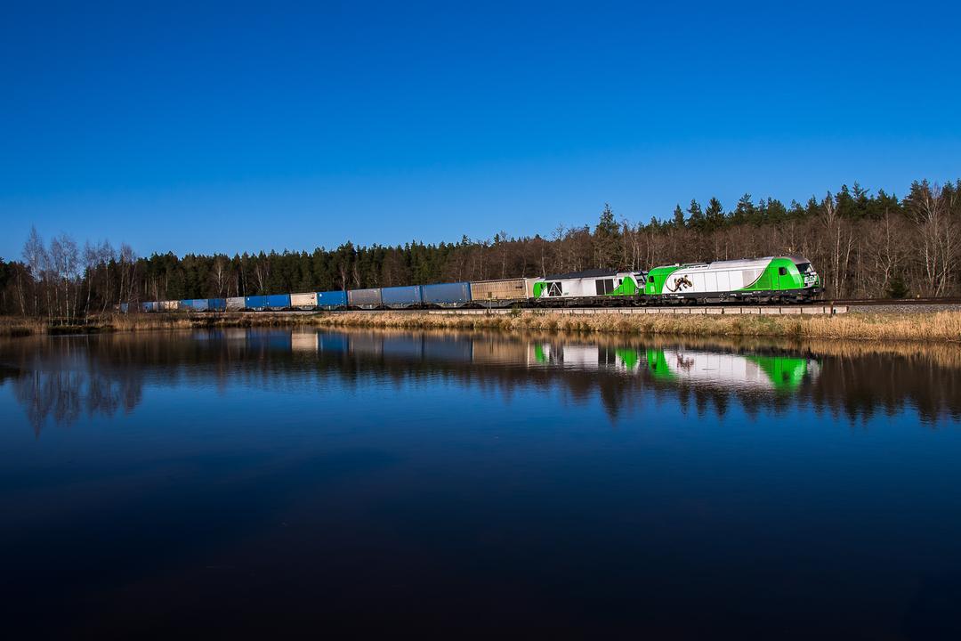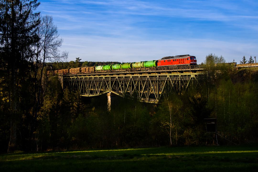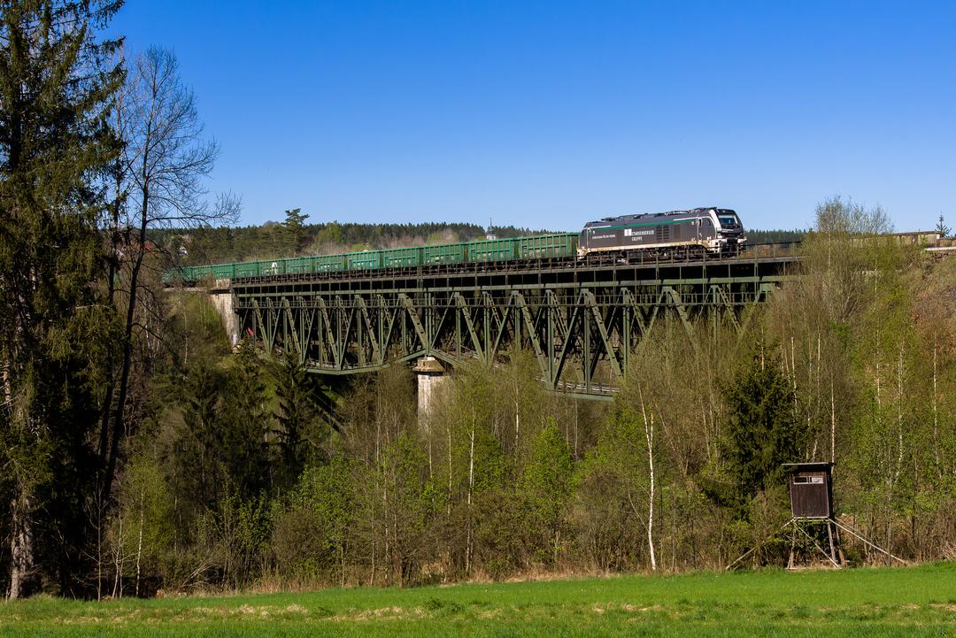 Aufgrund einer kurzfristigen Sperrung wurde die Schwandorfer Übergabe überraschend über das Pegnitztal umgeleitet und konnte mit fotogenem Wagenpark auf dem Neusorger Fichtelnaabviadukt festgehalten werden.