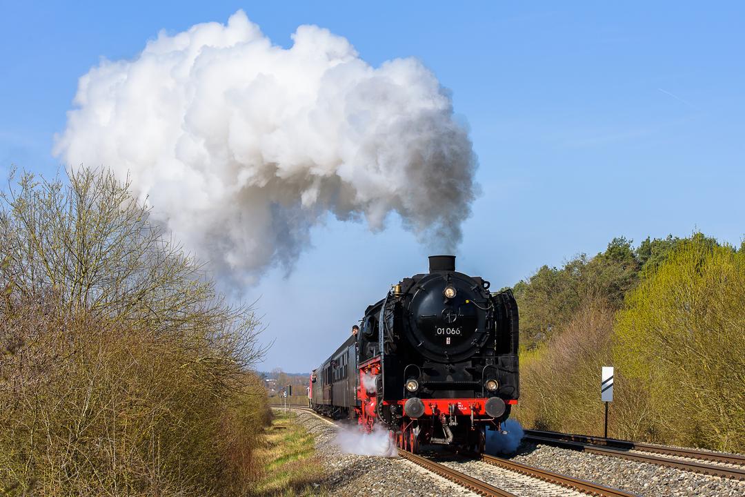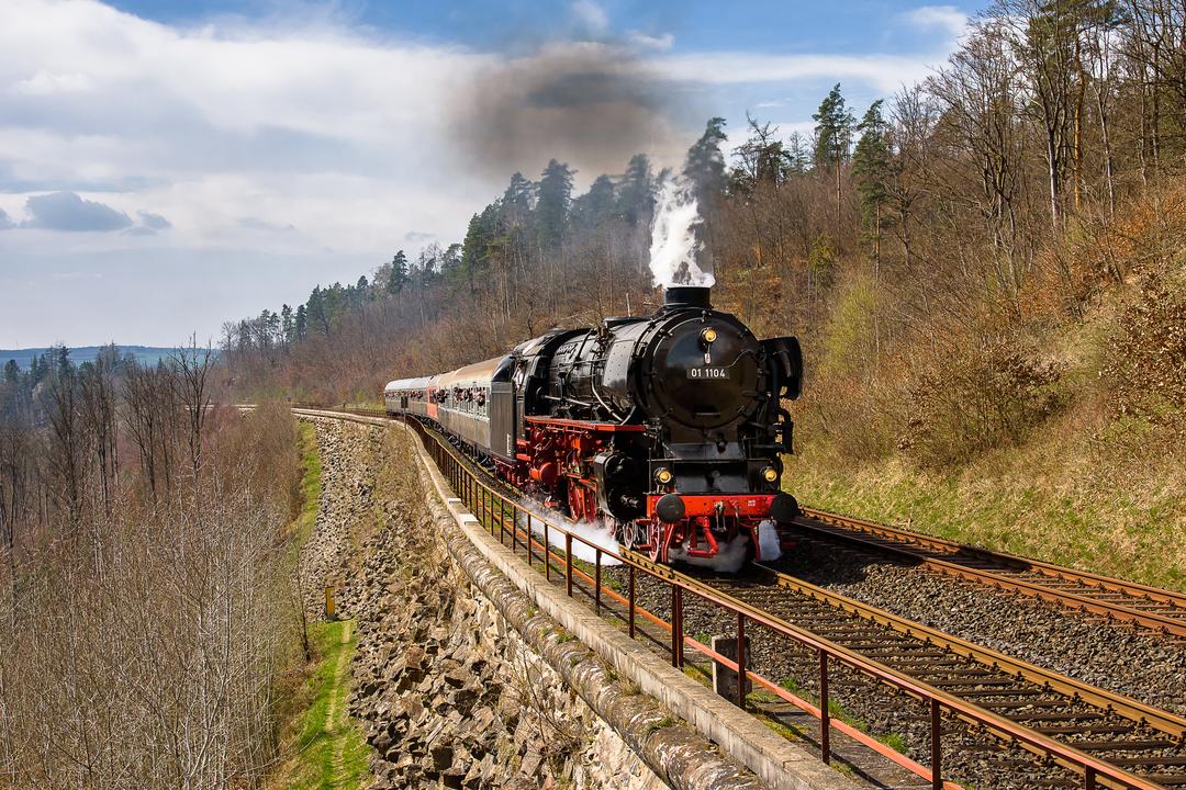 Einen Tag später besuchte 01 1104 die Schiefe Ebene. Aufgrund von Personen im Gleis verzögerte sich die Ankunft um Stunden. Immerhin klappte es dann in einem Sonnenloch.