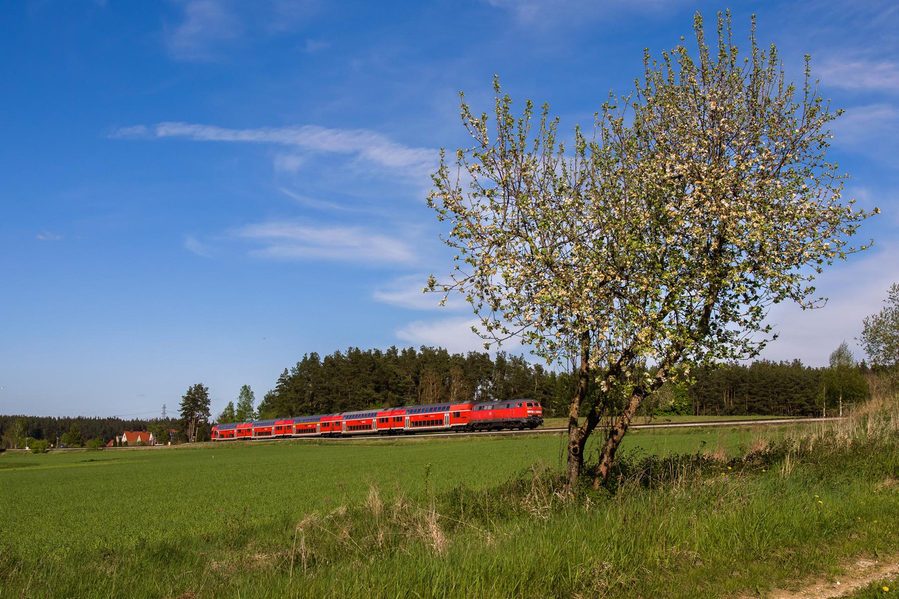 Bei diesem Foto hatte ich das Sonnenglück auf meiner Seite. In den folgenden 4 Wochen bis Mitte Juni hatte ich eine unfassbare Frustphase, wie ich sie noch nie erlebt habe. Von 25 Fotoaktionen gingen 23 schief. Meist waren es Wolkenschäden, teils blieben die Züge liegen, fuhren als Lz, bogen auf eine andere Strecke ab usw. Nichts hat mehr geklappt und ich hätte das Hobby am liebsten aufgegeben, da es nur noch Frust war.