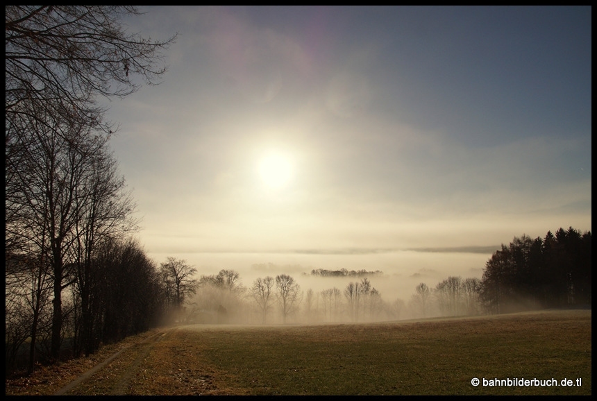 Da der Zug in Aue (Sachs) Kopf machen musste, war noch genügend Zeit für eine weitere Aufnahme auf der CA-Linie. Oberhalb des Lößnitzer oberen Bahnhofs war die Sonne noch am Nebel auflösen, als der Bundesbahn Diesel ein weiteres Mal vor die Linse fuhr.