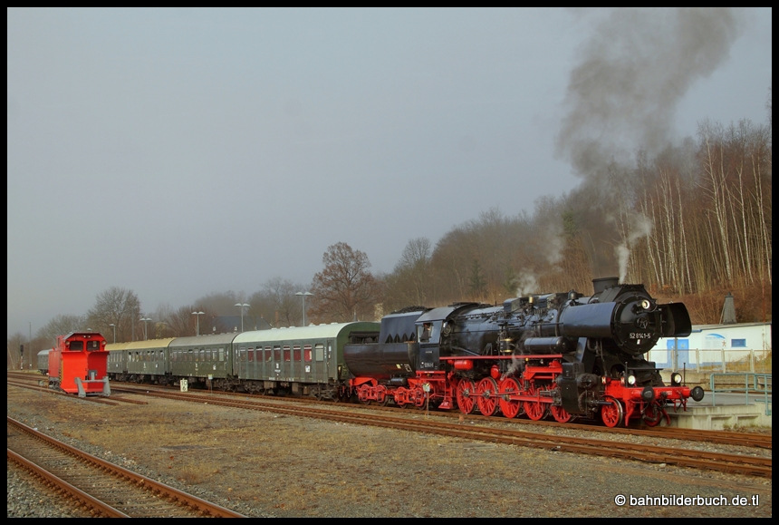 Der letzte Sonderzug am Samstag war dann DPE 28943 Chemnitz - Schwarzenberg. Der mit 52 8141-5 bespannte Zug wurde von mir zum Abschluss der Tour wieder in meiner Heimatstadt Aue erwartet. Leider war der Nebel wieder auf dem Vormarsch, als die Fuhre im Bahnhof zugegen war.