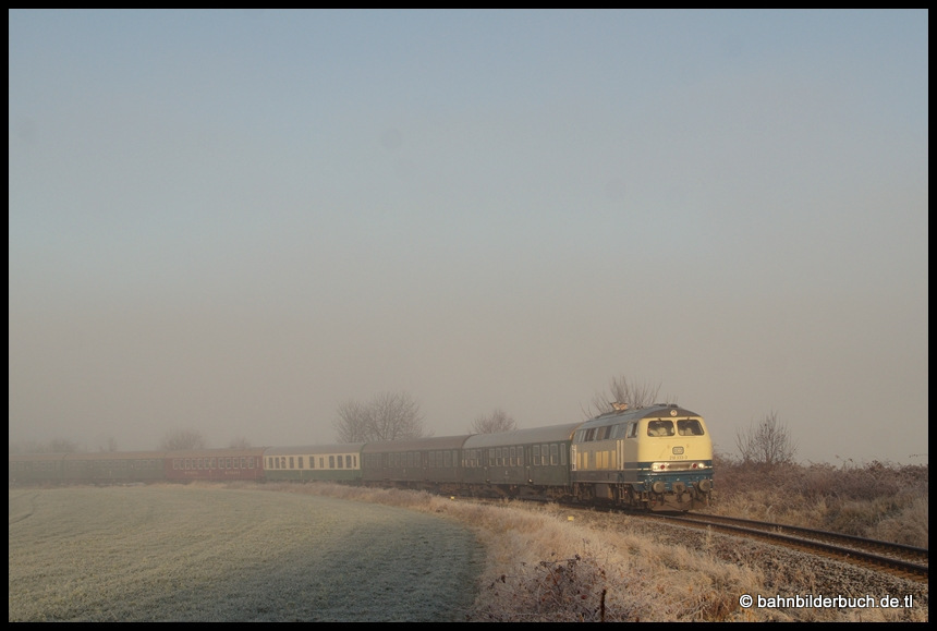 Am Wochenende zum 3. Advent sind traditionell zahlreiche Sonderzüge im Erzgebirge unterwegs. Schwarzenberg mit seiner Bergparade, aber auch zahlreiche andere Veranstaltungen lockten zahlreiche Gäste aus nah und fern ins Gebirge. Am Samstag lagen Sonnenschein und Nebel oft nur wenige Meter auseinander. Die Fototour des Tages begann meinerseits am Morgen in meiner Heimatstadt Aue wo pünktlich zum Sonnenaufgang 218 333-3 mit ihrem Sonderzug DPE 1828 Plauen - Olbernhau-Grünthal das markante Ziegelgebäude der Gebrüder Leonhardt GmbH & Co. KG Blema Kircheis in der Einfahrt zum Bahnhof Aue (Sachs) passierte.