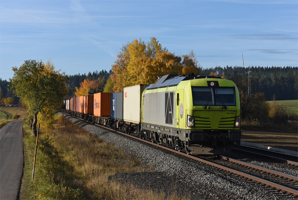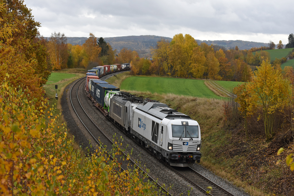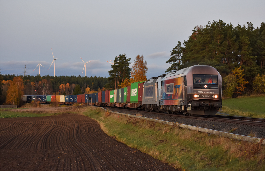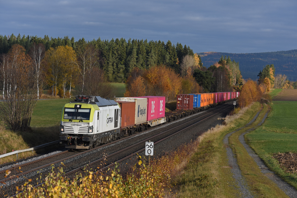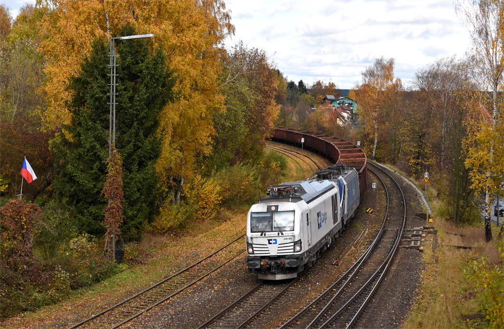 Zum Abschluss noch das Kapitel „Elbtalumleiter“ wegen Vollsperrung der Elbtalstrecke südlich Dresden. Im 4. Quartal gab es ab Ende Oktober (zur buntesten Fotozeit) und im Dezember (bei Nebel und Hochnebel) jeweils ca. eine Woche lang weitläufige Umleitungen der Güterzüge zwischen Norddeutschland und Tschechien. Nahezu stündlich fuhren durchs Fichtelgebirge überwiegend Containerzüge, wobei Engstellen die begrenzten Gleisanlagen für die Lokwechsel in Hof und Cheb bildeten, wenngleich METRANS und CD Cargo ihre E-Loks mitschleppten. Entschärft wurde der Richtungswechsel in Marktredwitz durch teilweise Verlagerung nach Pechbrunn, wo seit dem Umbau 2024 zwei lange Überholgleise genutzt werden konnten.