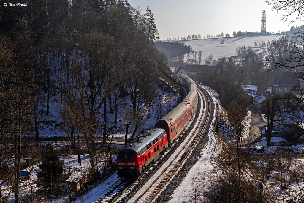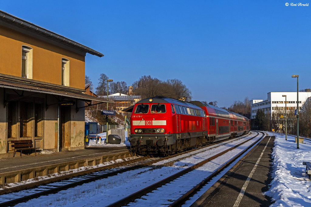 Langsam setzte die Müdigkeit etwas ein, aber ein Bild des nächsten RE2 nach Hof wollte ich noch abwarten. Also weitere 30min durchhalten. Auf der App staute sich die Verspätung immer mehr auf, am Ende über 20min. Also noch länger warten. Als 218 428 aus Regensburg Hbf zurückkam, endlich die Erlösung. Ich hatte mich einfach nur um 180 Grad gedreht, denn im Hintergrund thronte die Bohrstelle vom vermeindlich? oder reellen tiefsten Loch der Welt: