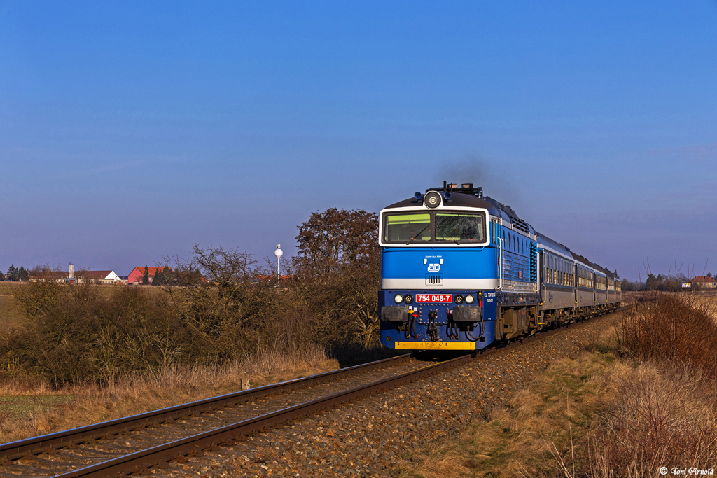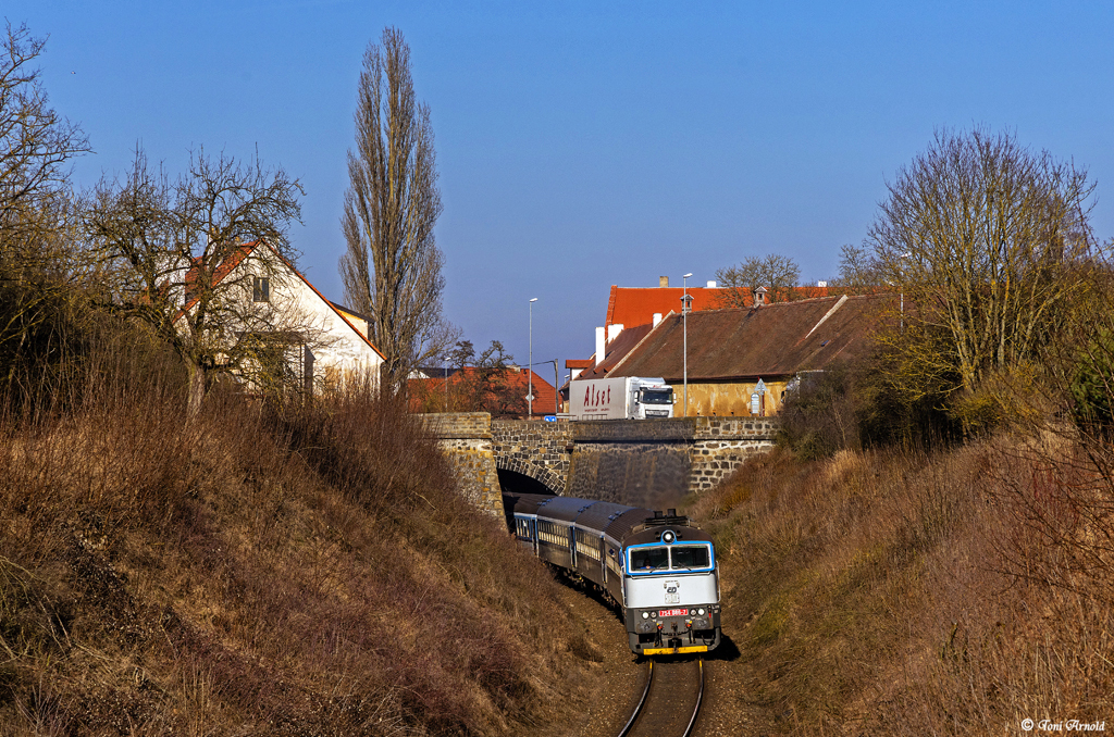 ist es mit dem Brilleneinsatz vor den Os-Leistungen zwischen Plzen und Domazlice. Bis Juli hält das Glück noch an, danach beginnt eine mehrwöchige Totalsperrung zwischen Stod und Vejprnice. Ersatz in Form zweier 844er soll in dieser Zeit zwischen Domazlice und Stod pendeln, die 754er derweil pausieren. Da ab Dezember der Verkehrsträgerwechsel zwischen CD und Arriva ansteht, sollen die 754er für die Zeit August-Dezember nicht nochmal zurückkommen. Aber wer weiß, vielleicht gibt es doch nochmal eine Überraschung. Der Freitag brachte nach vielen Tagen Regen und Schnee endlich auch mal wieder Sonne an den Winterhimmel. Der Ausflug gen Süden gestaltete sich kurz, aber effektiv. Der erste Os nach Domazlice kam mit 754 086 daher. Sie war seinerzeits die Zuletzt gelieferte 754 und gehörte lange zum Bereich Bohumin/Ostrava. Seit einiger Zeit versieht sie von Plzen aus ihre Dienste und ist hier zwischen Chotesov u Stoda und Stod am bekannten Bauerngehöft unweit der Hauptstraße Plzen-Domazlice unterwegs: