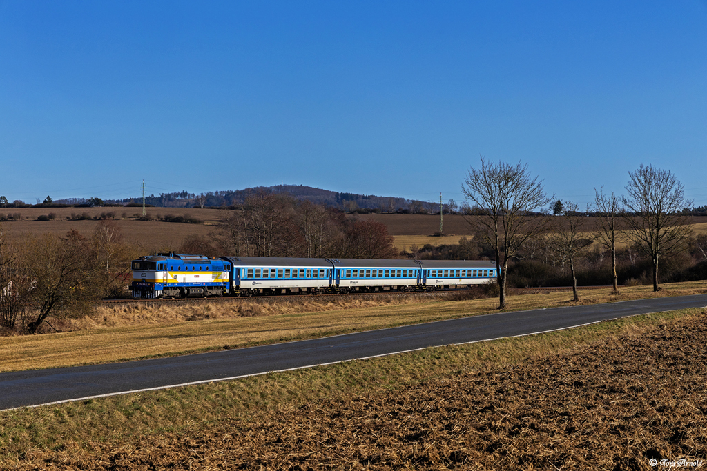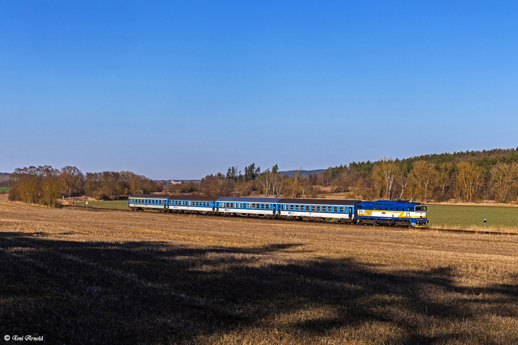 Als erste Lok am Nachmittag kam 754 022 mit dem ersten planmäßigen Os aus Plzen nach Domazlice daher. Zwischen Stankov und Osvracin klickte der Auslöser: