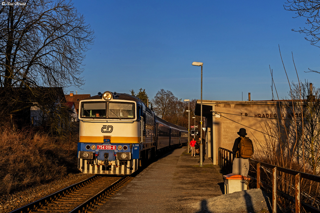 Am späten Nachmittag war dann wieder 754 019 dran, hier am Betonklotz des Hp Hradec u Stoda:
