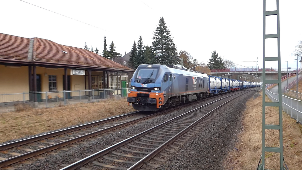 Kaum war die Katze um die Ecke verschwunden, kam schon der recht lange Tanktainerzug mit einigen Knickern am Ende und einer blau-orangen Eurodual der Netzwerkbahn Sachsen um die Ecke geschossen.